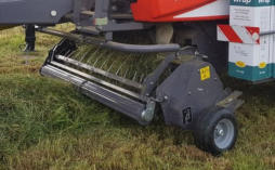 Rollenniederhalter, für einen effizienten Erntegutflus s Der Rollenniederhalter unterstützt den Pick-Up bei der Handhabu ng klein e re r Ern te gutmengen und so r gt d u rch sein e R o t at io n für ein e n ef fizienten Fluss. Der Halter ve rb essert auch die Ballenfo rm, indem er gro sse M engen Erntegu t niederhält, ohne  dass Klumpen en ts te hen . Dadu rch wird ein gle ichmässi g e r E rntegu tflus s ohne V ers topfung e n si cherge stell t . Auf Wunsc h m it Doppe lrol lennied e rhal ter